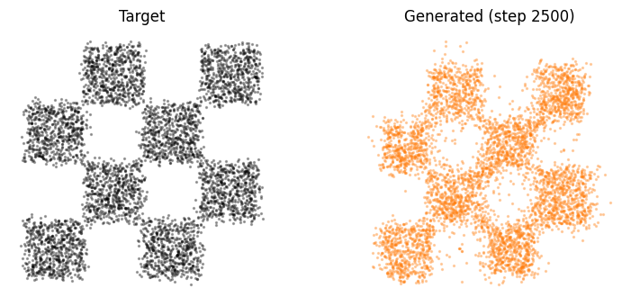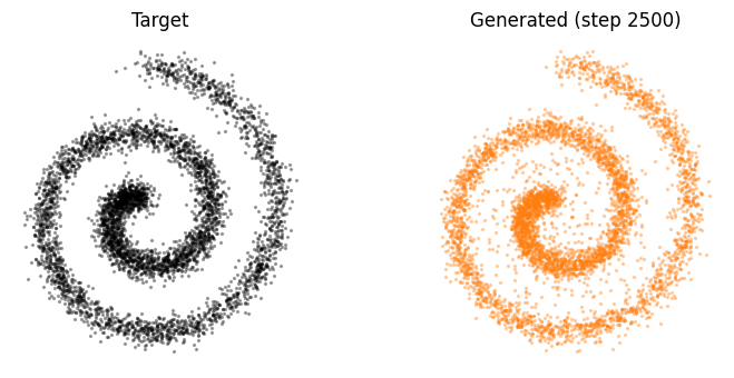 I was able to train the model on the toy distributions (chessboard, spiral). After 2.5k iterations, the drifting model produced some pretty neat results.